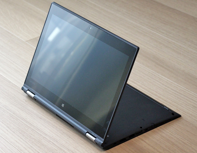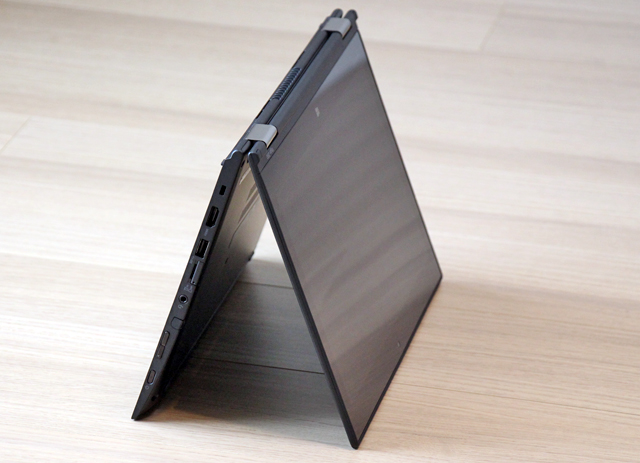 テントモード。 名称通り、テントのようにノートを立てた状態で利用します。 こちらもスタンドモードと同様に画面が手前に来るため、映像などのコンテンツが閲覧しやすく、またタッチ操作がしやすいです。 テントの角度を調整する事で、スタンドモードの状態よりも設置面積が少なくて済むというメリットもあります。